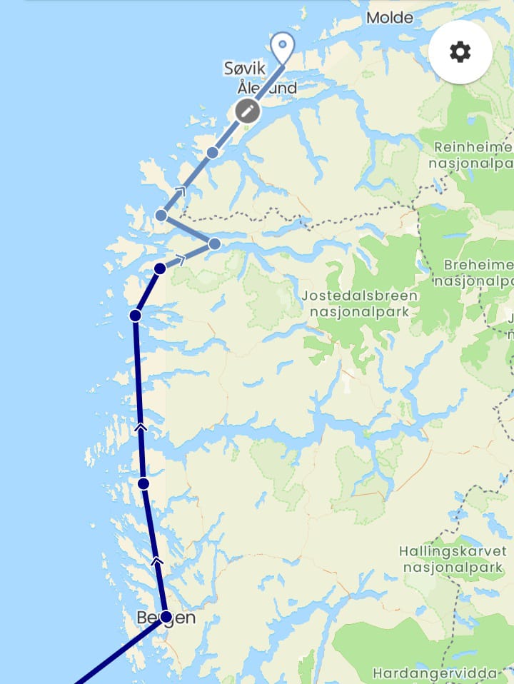 After a swift run downhill from yesterday's spot, leaving the midges behind, the old bike crossed a bridge onto the next island -- Hariedlandet -- we were soon amidst the heaviest trafffic we've encountered so far. As far as I can work out, this was due to vehicles filtering in from a busy E-route on an adjoining landmass. When I stopped before a small tunnel to turn my lights on, a chap in a 4x4 pulled in and offered me a lift. I hadn't worked out why yet, and politely declined, though I'm sure he'd have soon regretted having an unwashed wild-camping cyclist, his bike, and 30 kilos of gear in his rather nice car. It was very kind of him, all the same. A few kilometres further on the road became still narrower and ran up a three kms hill, presenting a dilemma: Norwegians are the most courteous of drivers to cyclists, and simply won't pass you at all unless they can give you the recommended 1.5 metres freeboard. Crawling up a hill, you clearly can't leave cars and heavy lorries behind you curtailed to little more than a slow jog, unable to overtake because the traffic coming the other way is just as heavy. Therefore I had to keep pulling in, after which it was difficult to get going again, so ended up pushing for much of the distance. Thankfully, at the top of the hill was a college of some sort, and to assist its students, a cycle path runs all the way from there to the Alesund ferry.